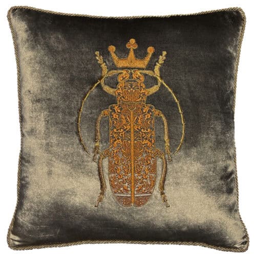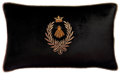 Old Gold Bee and Crown with Pink Gold Wreath on Black Velvet Rectangle Cushion