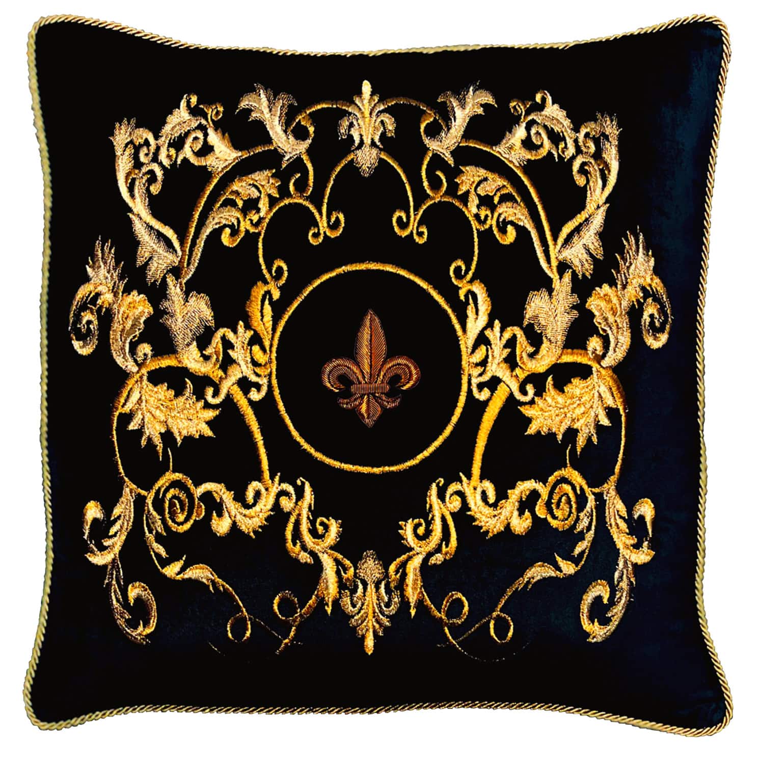 Zardozi embroidered Antique Bee in machine embroidered old gold Cameo and yellow gold leaves detail on black velvet and the cushion is trimmed with gold coloured piping cord.